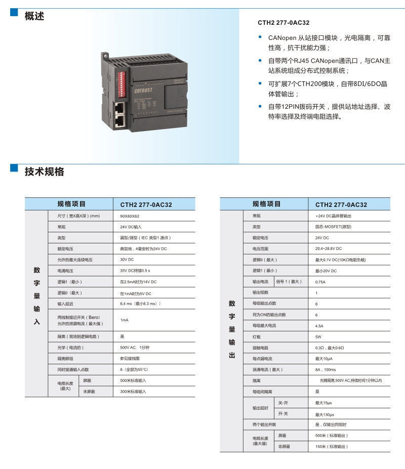 | CAN從站模塊,自帶8DI/6DO,光電隔離 | CTH2 277-0AC32 |